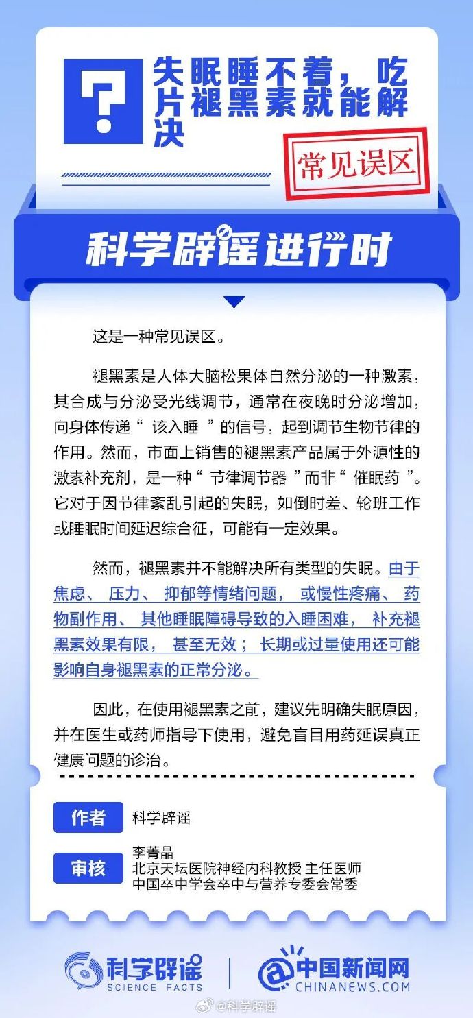 市面上销售的褪黑素产品属于外源性的激素补充剂,是一种“节律调节器”而非“催眠药它对于因节律素乱引起的失眠,如倒时差、轮班工作或睡眠时间延迟综合征,可能有一定效果。然而,褪黑素并不能解决所有类型的失眠。由于焦虑、压力、抑郁等情绪问题,或慢性疼痛、 药物副作用、 其他睡眠障碍导致的入睡困难, 补充褪黑素效果有限,甚至无效;长期或过量使用还可能影响自身褪黑素的正常分泌。