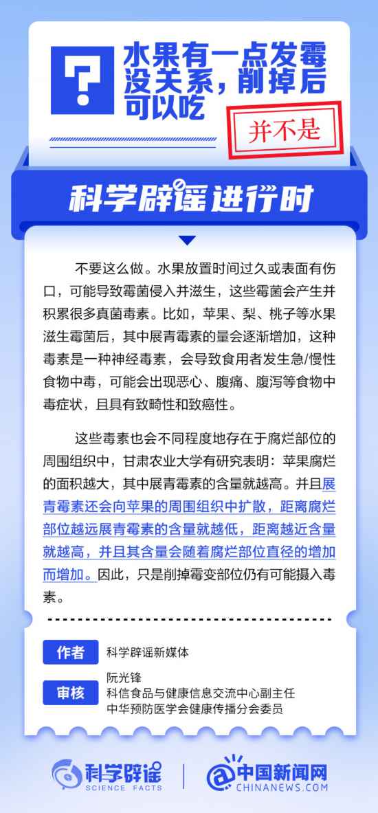 水果放置时间过久或表面有伤口,可能导致霉菌侵入并滋生,这些霉菌会产生并积累很多真菌毒素。有研究表明:苹果腐烂的面积越大,其中展青霉素的含量就越高。并且展青霉素还会向苹果的周围组织中扩散,距离腐烂部位越远展青霉素的含量就越低,距离越近含量就越高,并且其含量会随着腐烂部位直径的增加而增加。因此,吃只是削掉霉变部位的水果仍有可能摄入毒素。